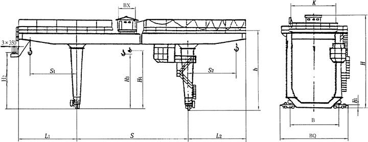 雙梁吊鉤門式起重機適用露天倉庫、料場、鐵路貨站、港口碼頭等裝卸搬運。還可以配以多種鉤具進行多種作業。起重機有橋架、大車運行機構、小車、電器設備等組成。橋架采用箱型雙梁焊接結構,大車運行機構采用分別驅動,機構均在操縱室操縱。本系統起重機正常使用的環境應在一25℃~+40℃范圍內,24小時內的平均溫度不得超過十35℃。其它安裝使用地點的海拔高度不得超過2000米,超過1000米的應對電動機容量進行校核。